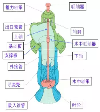 ??立式混流泵零部件(如圖)包括吸入錐管、導(dǎo)流殼、連接管、出水彎管、葉輪、主軸、推力軸承、導(dǎo)軸承、底板、電機(jī)架等。葉輪結(jié)構(gòu)復(fù)雜,大型混流泵葉輪鑄件。殼體可以使鑄件,也可以是焊接件。軸為鍛件